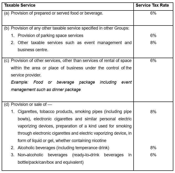 regulations, in cases where F&B operators offer other taxable services, the rate may not necessarily be fixed at 6%. If a Group B registered person offers a variety of taxable services, the service tax rates are determined based on the specific type of taxable service provided, rather than the primary service. However, if these taxable services are bundled together as a package, the service tax rate is determined based on the taxable service’s Group.